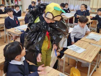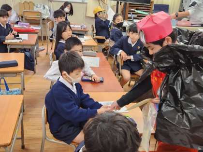 各学級での「えほんのじかん」のあと、“あいさつレンジャー”が教室に訪問し、1人1人と朝のあいさつを交わしていました!