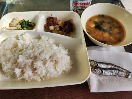 きょうの「みそ汁」は、“にぼし”を使った出汁が使われています。調理員さんが見本ケースに、今日実際に使った“にぼし”をおいてくださいました。