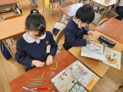今日は長さの違うストローを組み合わせて三角形を作り、どのような特徴があるかをみんなで考えていきます。