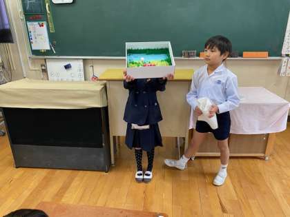 2年生の教室では、冬休みに取り組んだ自主学習や工作などの発表会が行われていました。