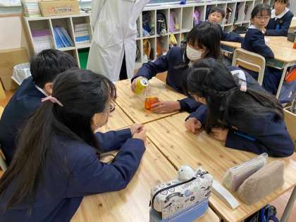 貧血の薬をお茶に混ぜると黒っぽくなり、うがい薬にビタミンC飲料を混ぜるとうがい薬の色が消えてしまいました。大きな色の変化に子どもたちはびっくり!