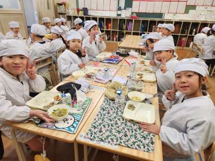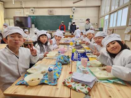 今日の給食時の様子は、1年生の写真を使っています。