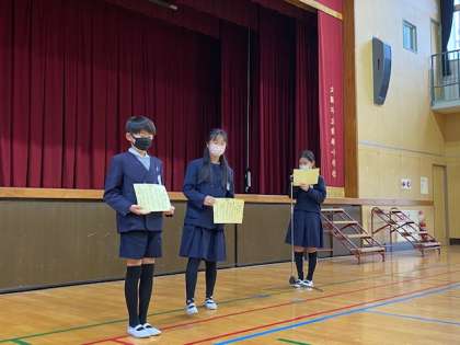 年賀状コンクールの表彰では、まず各学年2位の人の名前が呼ばれ、続いて1位の人の発表と表彰がありました。今年も素敵な作品がたくさん並んだ年賀状コンクール。みごと1位になったみなさん、おめでとうございます!