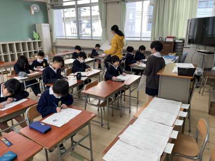 算数科では3年生からクラスを2つに分けて少人数授業を行っています。コースに分かれてじっくりと理解を深め、技能を磨いたり、どんどん問題を解くことで習熟に努めたりします。小学校では一人ひとりのの課題に合わせた個別支援を重視する場面とクラスのみんなで一緒に考えながら深め合う場面を組み合わせながら授業を行っています。