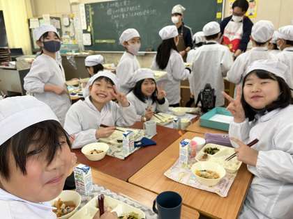 今日は大阪らしいメニューが並びました。今月は5年生が沖縄の小学校と給食交流をオンラインで行う予定があります。沖縄にも同じ名前の「豊崎小学校」があることから、今回の交流につながりました。(先月、沖縄では大阪の豊崎小学校と同じ給食が実施されました。)今回の交流では、それぞれの学校の今日のような郷土にちなんだメニューが紹介されたり、それぞれの学校や地域の様子について学ぶ予定です。