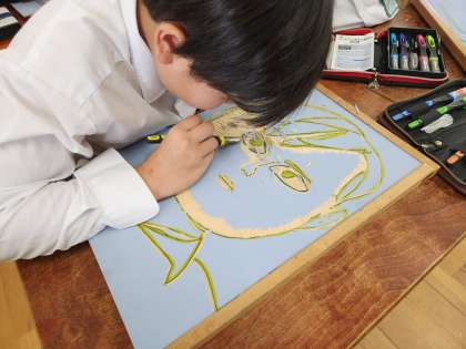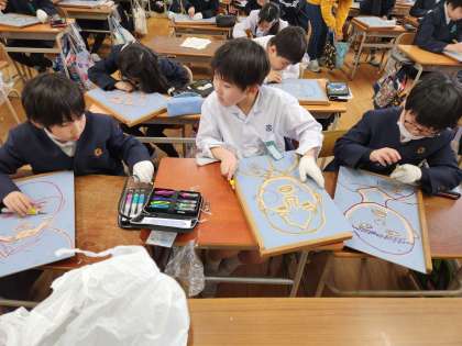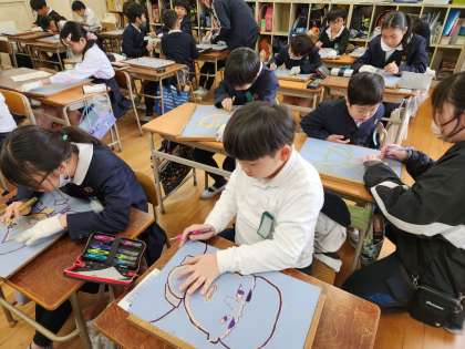4年生が取り組んでいる「木版画」の制作、いよいよ彫刻刀を使って木版を彫り始めています。