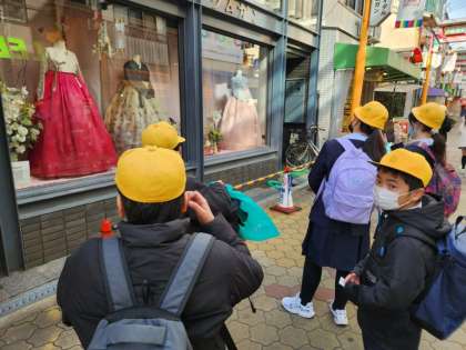 ほとんどの子が「コリアタウン」に行くのは初めてということでしたが、事前学習もしっかりと行い、さっそく班ごとに分かれて活動を始めていきます。