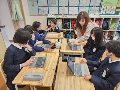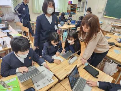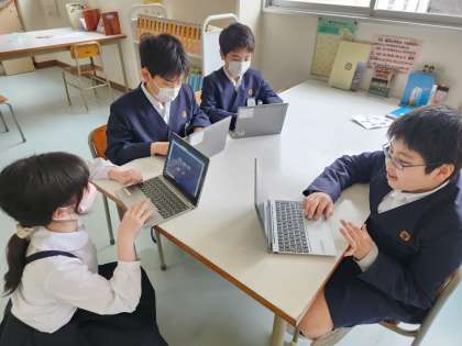 自分たちが学ぶ「豊崎小学校」がどんな学校か、写真を使ってタブレットにまとめたり、動画を撮ったりして、当日に備えています。