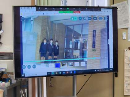 画面先の豊見城小学校のみなさんのあたたかかい笑顔が、豊崎小学校の教室に飛び込んできました!