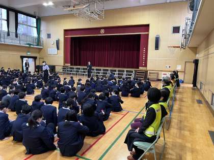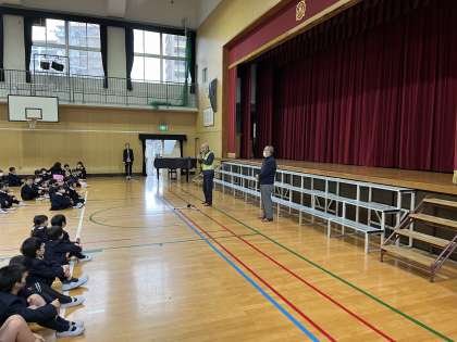 今日は、日ごろお世話になっている地域の皆様、みまもり隊の皆様をお招きして花のプレゼント式が行われました。この日のために、昨年の秋から児童らは毎日水やりをして花の苗を育ててきました。今年はあいにくの日照不足でまだ開花にはいたっていないものが多かったのですが、地域の代表としてお越ししただいた豊崎社会福祉協議会会長・小玉様、第一豊栄会会長・高橋様からは「大事に育てます」とのうれしいお言葉を頂きました。