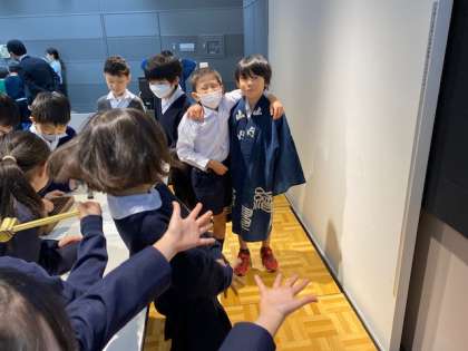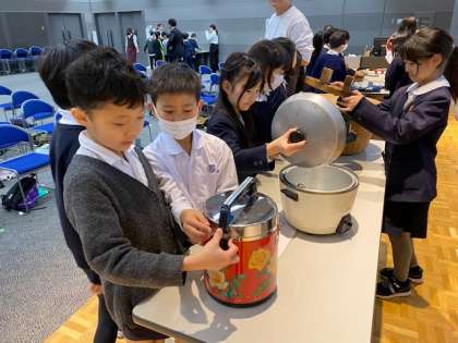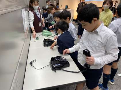 実際に、昔の道具を触ってどのように使っていたのか考えています。炊飯器や蔵の鍵、筆箱など今とは違う形の道具に子どもたちは興味津々です。昔の電話って、どうやってかけるのでしょうね?