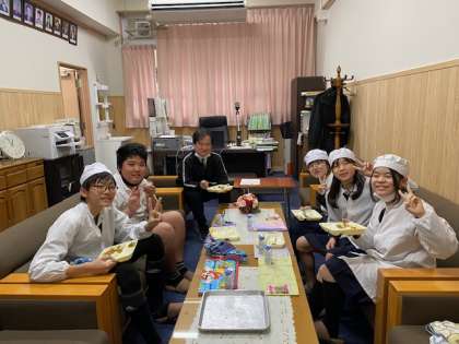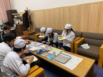 にぎやかな笑い声が校長室から聞こえてきます。今日の献立は、カレーライス、きゅうりとコーンのサラダ、スイートポテトです。卒業を前にして初めて給食に出たスイートポテト。6年生が「美味しい!」と食べていました。