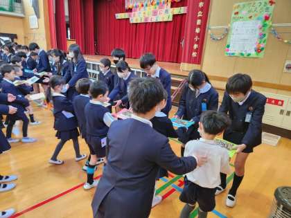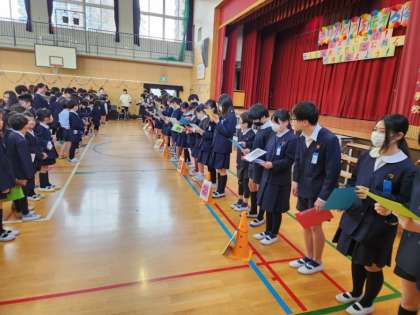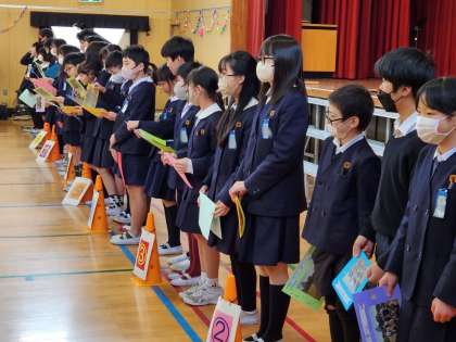 1年生から5年生が書いた、心あたたまるメッセージのプレゼントが、6年生に手渡されます。