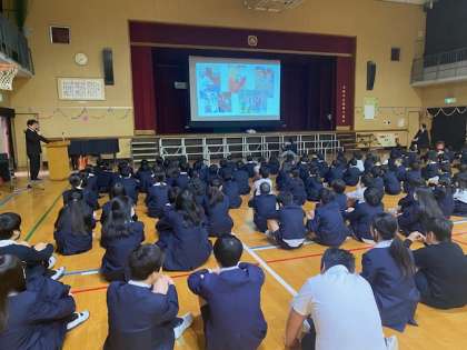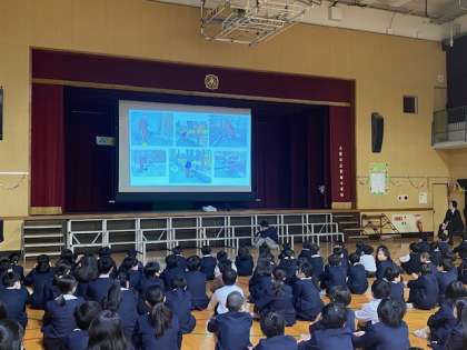 今日の朝会は、自主的に地域の清掃活動に取り組んでいる5年生と、毎朝校区をお掃除してくださっている昭和設計の皆様の紹介でした。