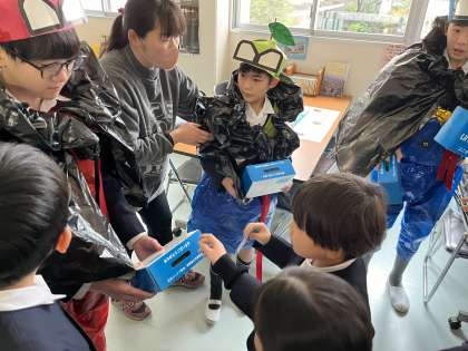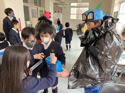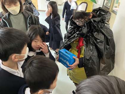 今も日々復興に向けて大変な苦労をされている能登半島地震の被災地の皆様に何か応援できることはないか、そんな思いを児童会のメンバーが話し合い、本校でも募金活動を行うことを発案しました。今日はその初日です。早速たくさんの児童が募金に集まっていました。この日のために好評を博したあいさつレンジャーが再び集結していました。
