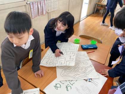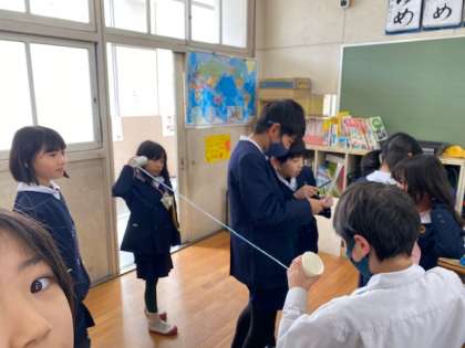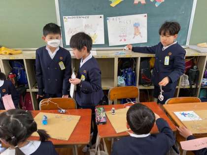 今日は、2年生を招待して「おもちゃランド」で遊んでもらいました。みんなお兄さんお姉さんらしく、優しくルールを教えたり、得点を数えてあげたりしていました。糸電話や、磁石のめいろなど、工夫がいっぱいです!
