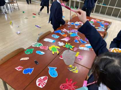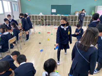 隣の教室には、魚釣りや、ゴムの力で動く車もありました。3年生は、2年生に楽しんでもらえるように、自分たちで考え工夫しておもちゃランドを作ってきたそうです。