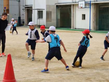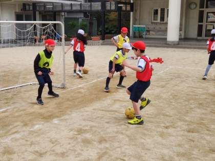 今日は“サッカー”と“おにごっこ”を融合させた、面白い「ボールけり運動」をしていました。