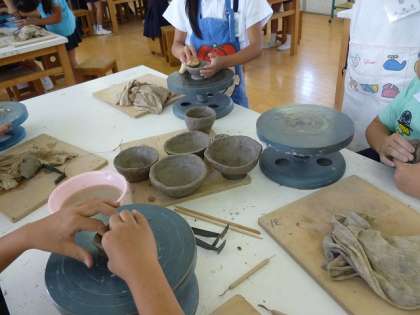 粘土を練ったり「ろくろ」を使ったりして,たくさんの作品ができあがりました。