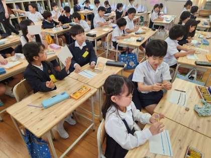 図画工作の時間に、3年生が“パス”を使った様々な技法の練習をしていました。