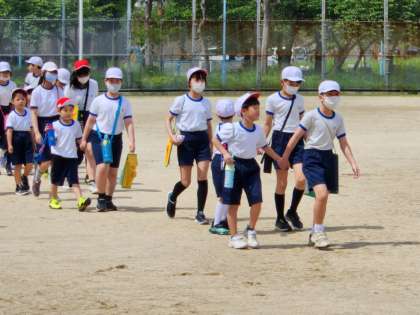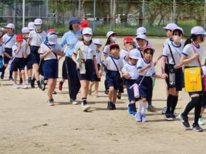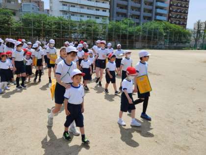 1年生は、6年生のおにいさん、おねえさんに連れられて、本庄グラウンドに入場です!