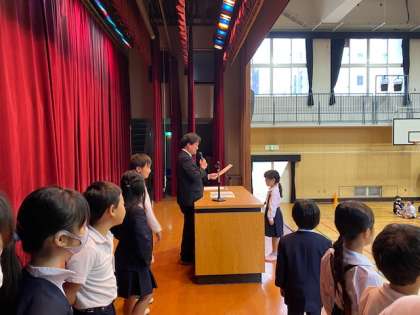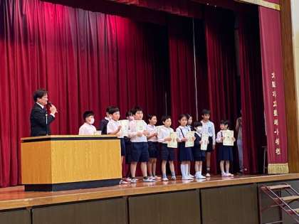 お話の後、今年度初めてのギャラリー表彰がありました。絵や視写など、1年の初めらしい作品ばかりでした。