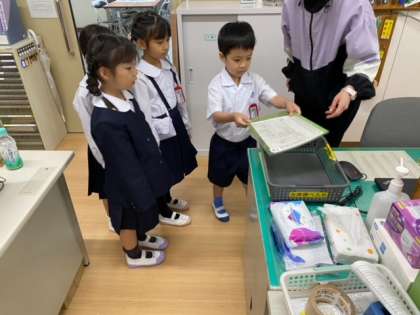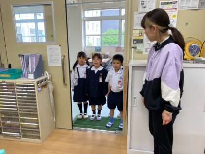 1年生の保健係さんたちが、健康観察表を職員室に届ける練習をしていました。