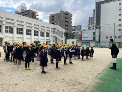 交通マナーなどの確認をした後、教頭先生のお話を聞いてからいざ出発!目指すは長居公園の自然史博物館です。