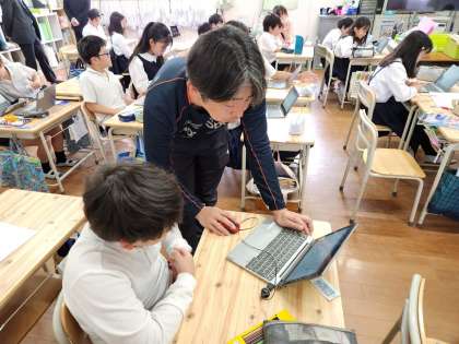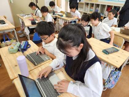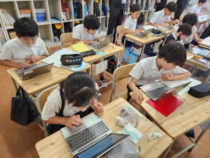 紙を使って新聞をつくることも多いですが、5年生は端末を使って新聞づくりをしています。