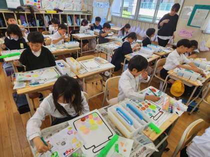 3年生は図画工作の時間に、水彩絵の具を使った「おいしい(^▽^)/ 100味キャンディー」の絵を描き始めています。