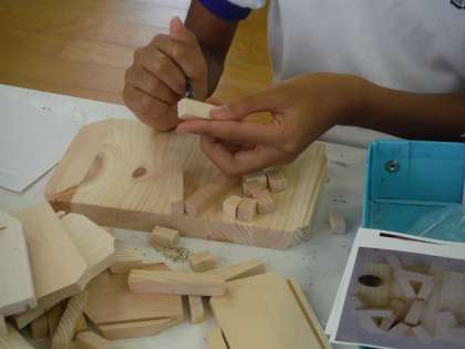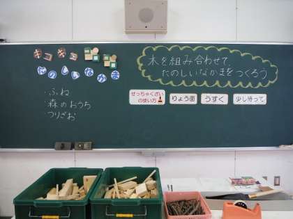 並べて,重ねて,組み合わせて。たくさんの素晴らしい作品が図工室に並んでいます。完成まであと少し!「ギコギコ,コロコロ」 みんなでがんばろう!