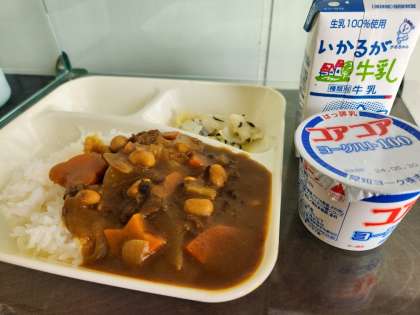 今日のカレーライスには「大豆」が入っており、たんぱく質や食物繊維が豊富に摂れるように工夫されています。