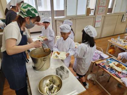 さまざまな形をした「ラッキーにんじん」を、調理員さんが入れてくださっています!