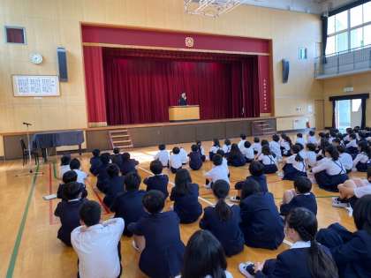 全校朝会では、校長先生から、心を込めて字を書くことの大切さについてお話がありました。
