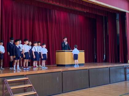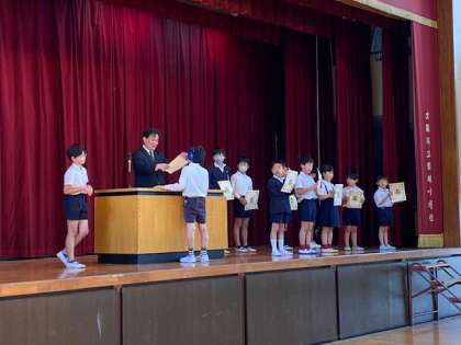 校長先生のお話の後は、ギャラリー表彰がありました。図工の作品や習字、新聞など素敵な作品ばかりでした。