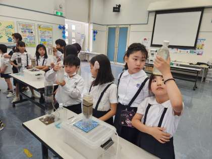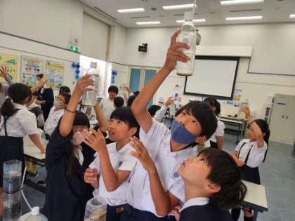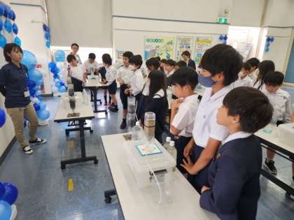 室内に戻り、どのような仕組みで水はきれいになるのか、模型を使って各班で実験を行います。