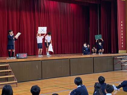集会委員から出されるクイズに、班のみんなで相談して丸かばつかで答えます。