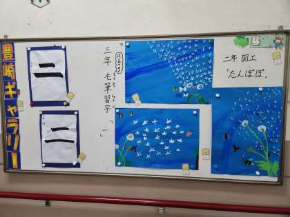 豊崎小学校では、子どもたちが授業中に頑張って完成させた数々の作品を階段の踊り場などに展示する「ギャラリー展示」が行われています。