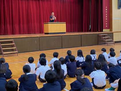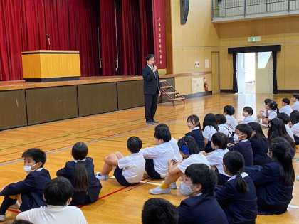 今日の朝会は、安まち隊の方が来校され、自転車の安全な乗り方についてお話がありました。