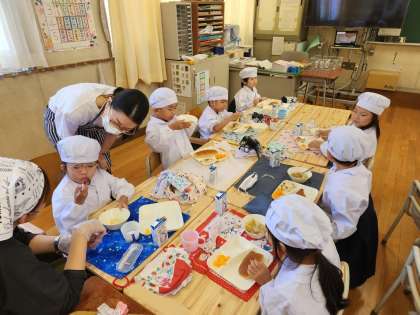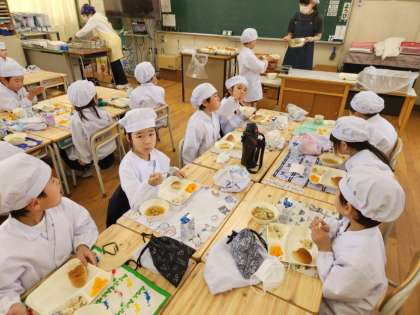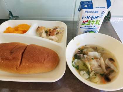 今日の「マカロニグラタン」は、鶏肉と玉ねぎを炒めたものに、クリーム、小麦粉、牛乳、グリンピース、マカロニを加え、チーズとパン粉をふって焼いています。