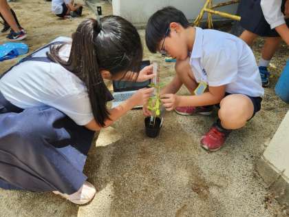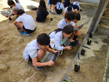 “ほうせんか”と“ひまわり”を育てている3年生。