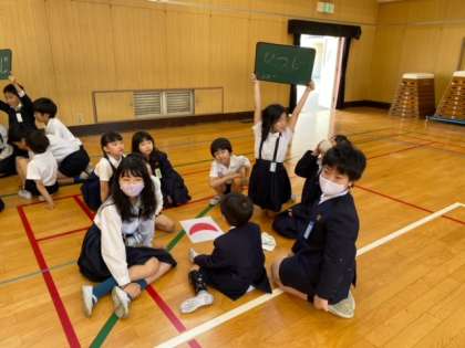 集会委員が、声で表した音が何の音なのかをたてわり班で相談して答えます。
