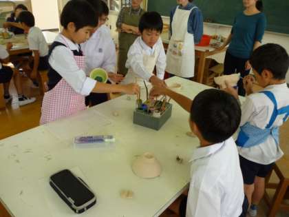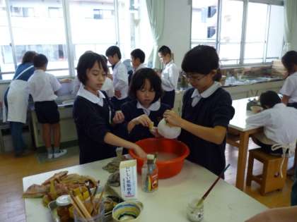 本日は陶芸体験の2回目。1回目と同じく,山名先生にご指導いただき,絵付けと釉(ゆう)がけをしました。絵付けは,立体でカーブしている面に描くので難しかったようですが,好きな色を使って一所懸命描いていました。絵が描けた子は,長石釉という焼き上がりに透明な色になる釉薬をかけました。山名先生がすぐに窯に入れてくださり,現在焼成中です。