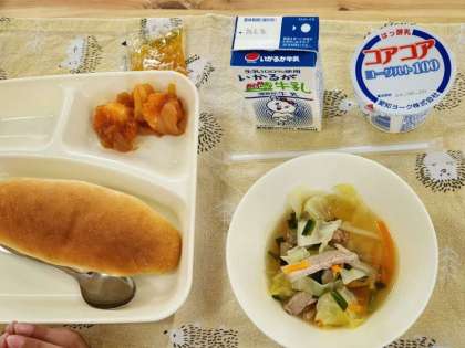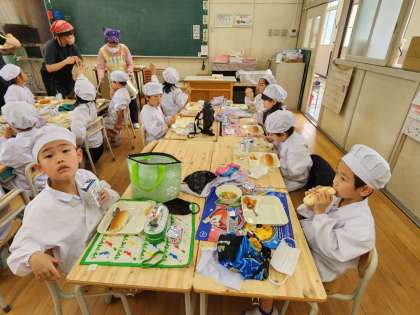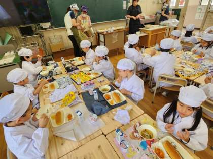 「海老のチリソース」は、揚げた海老にたまねぎ、しょうが、にんにく、トウバンジャンなどの香味野菜、調味料を炒めたものと混ぜ合わせいただきます。子どもたちから人気のあるメニューの一つです。