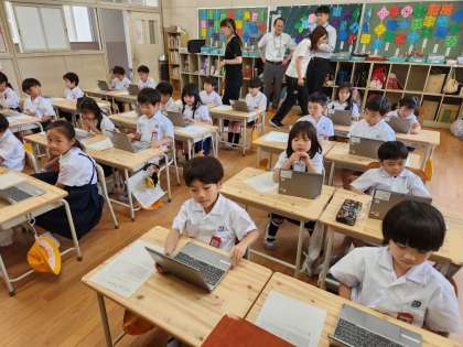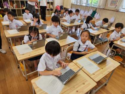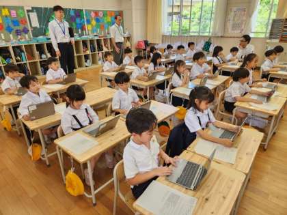 1年生は今日、小学校に上がって初めて「タブレット端末」の操作の練習をしました。