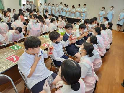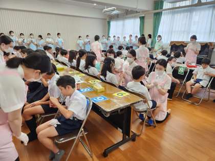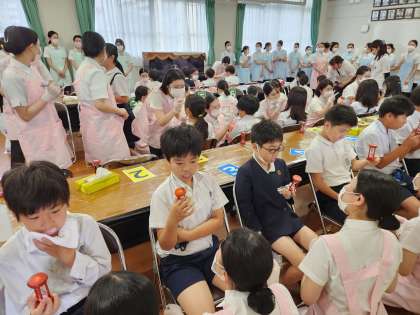 歯科衛生士の実習生さんにもご協力いただき、歯みがきの正しい仕方を教えていただき、虫歯予防のためのフッ素塗布も行われました。