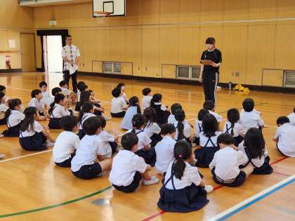 今日は1年生、2年生が体育館に集まって、プール水泳指導が始まるまでの準備や、当日の流れ、プールでの注意点などを、先生から教えていただきました。