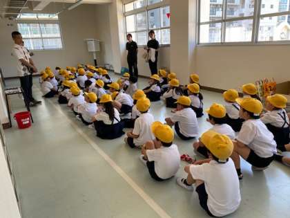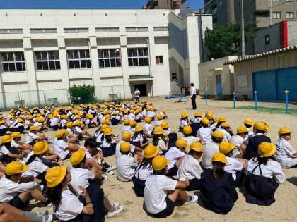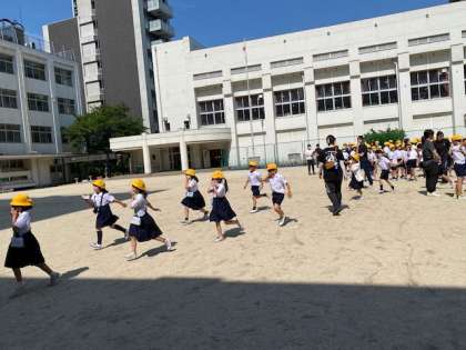 地震・津波による避難訓練が行われました。地震発生時は、揺れがおさまるまで机の下などにもぐり、上から落ちてくるものから頭や体を守ります。その後の津波警報が発令した際の避難訓練では、新校舎の5階と6階に避難をしました。