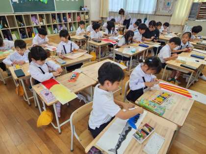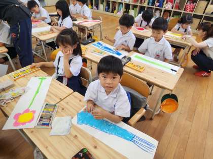 1年生は図画工作の時間に、細長い画用紙を使って絵を描いていました。