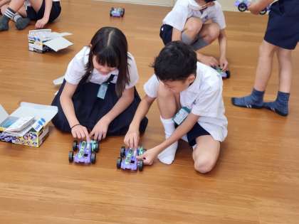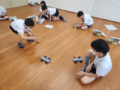電池のつなぎ方を変えて、モーターカーの走る速さを比べます。